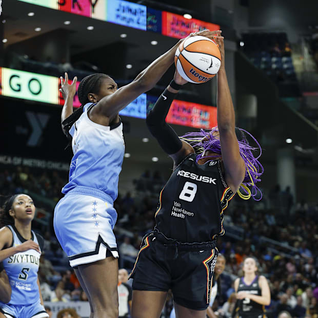 Sep 3, 2025; Chicago, Illinois, USA; Chicago Sky center Elizabeth Williams (1) blocks Connecticut Sun forward Aaliyah Edwards (8) during the first half at Wintrust Arena. Mandatory Credit: Kamil Krzaczynski-Imagn Images / Kamil Krzaczynski-Imagn Images